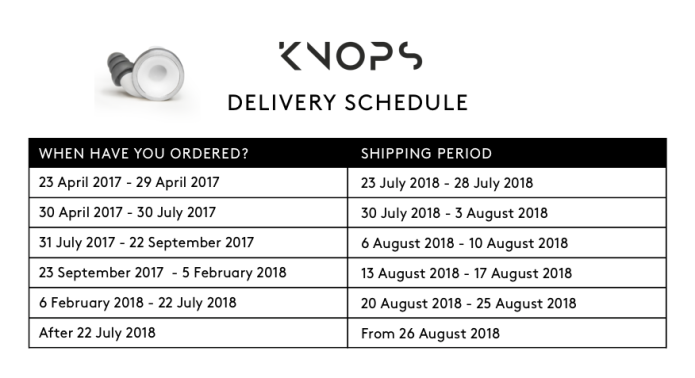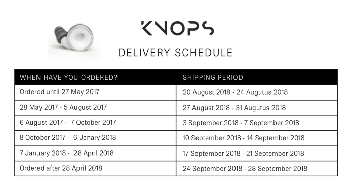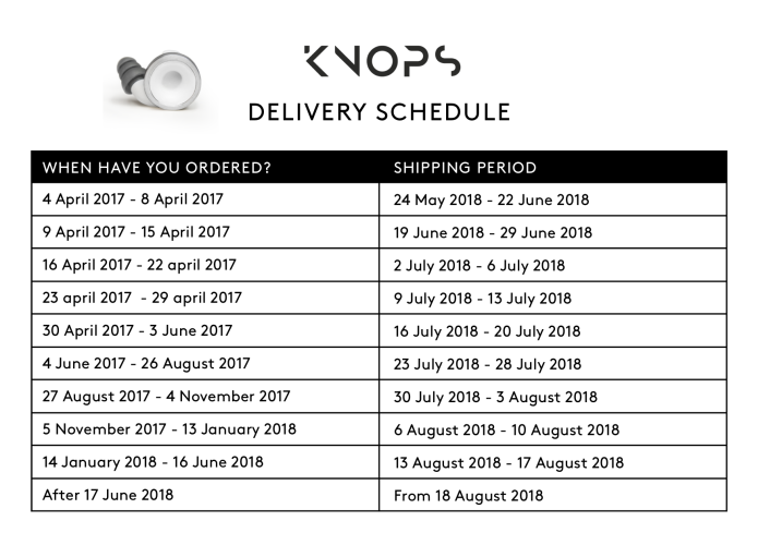 After producing the Knops they are sent to our packaging party to be packaged and then to our shipping partner to be sent out to you guys. This process usually takes two/three days. This means that the Knops we are producing next week will be shipped the week after. Ok, let’s now have a look at the estimated shipping dates. We have updated the delivery schedule. At this moment we have a delay of 2-4 weeks, depending on when you ordered.